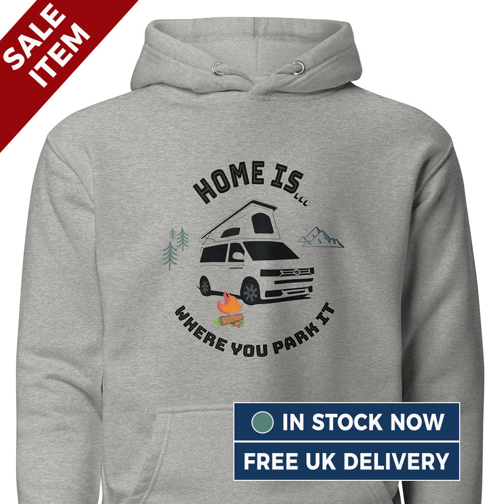 Stylish Vanwear Hoodie from the Volkswagen collection featuring another eye-catching design dedicated to outdoor van adventures. 'Home is Where You Park It' is a well-used phrase in the Van Life world and deserves its own Hoodie.